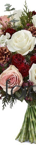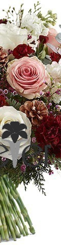 5 x Pink Roses, 5 x White Roses, 3 x Red Carnations, White Lisianthus, 2 x Pine Cones, Eucalyptus